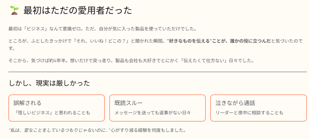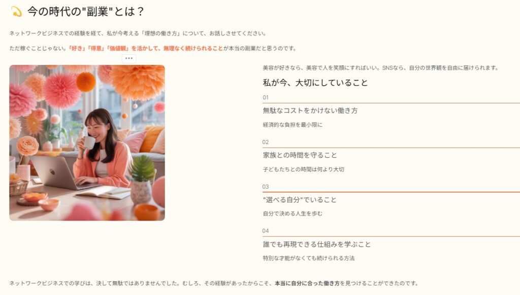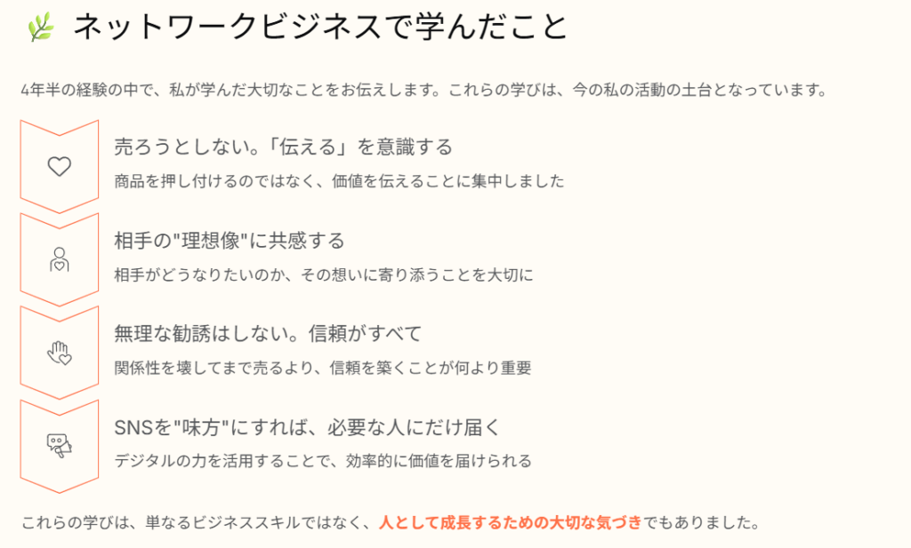 私自身も、最初はSNSで頑張っても成果が出なかったり、友達に声をかけてつらい思いをしたり…。そんな失敗を経て、“やり方を変えること”の大切さを知りました。だからこそ今は、無理せず、楽しく、続けられる副業スタイルを提案しています。