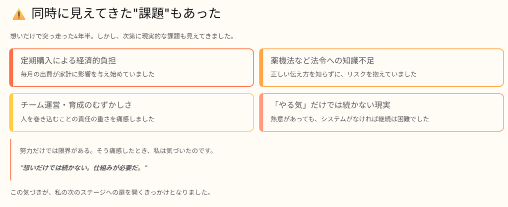 “想いだけでは続かない。仕組みや正しい知識が必要。”